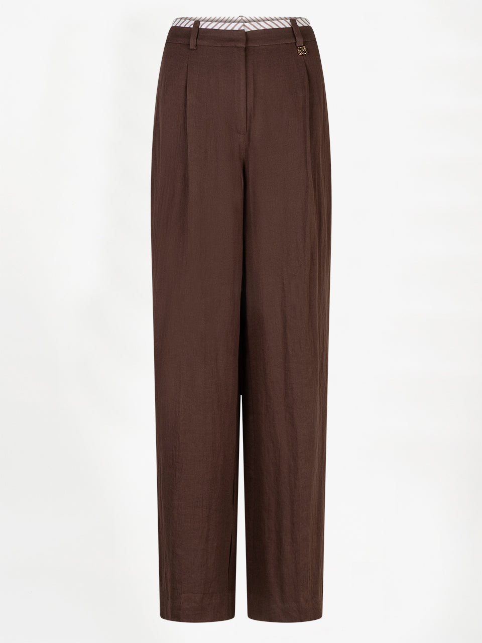 Die Hose Kenila in Chocolate Brown besteht aus einer Viskosemischung mit einer leinenartigen Textur. Die Hose mit weitem Bein hat ein attraktives Detail am Bund. Das Nadelstreifenfutter bildet einen dekorativen Rand am Bund. Dieses Detail verbindet sie mit dem passenden Blazer Dayva, der mit dem gleichen Futter ausgestattet ist.