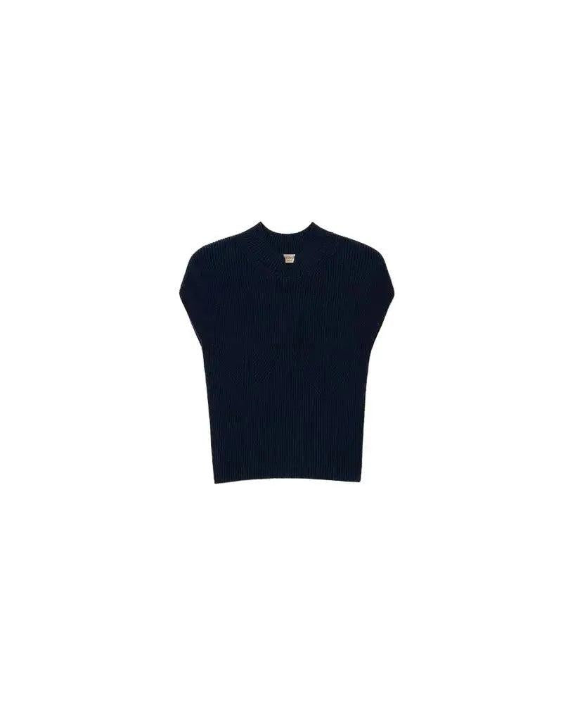 Figure-emphasized stand-up collar sweater made of viscose and stretch with rib processing, which creates a decorative motif on the front, V-neck on the stand-up collar, short sleeves and "oval t" logoplake made of metal on the back.