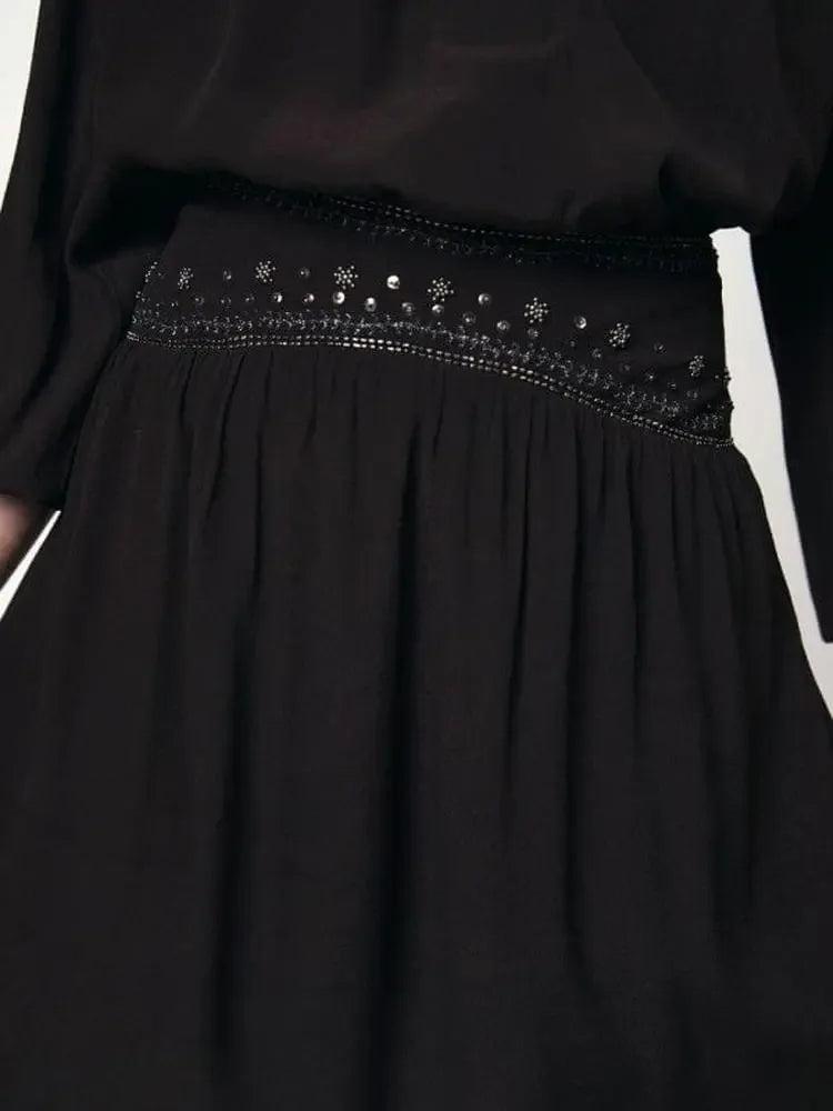 Complete your wardrobe with a Bohemian look skirt. The skirt is made of 100% viscose crepe-geared. It is decorated and gives your outfit a touch of sophistication and extravagance. The feed is made of 100% viscose voile.
