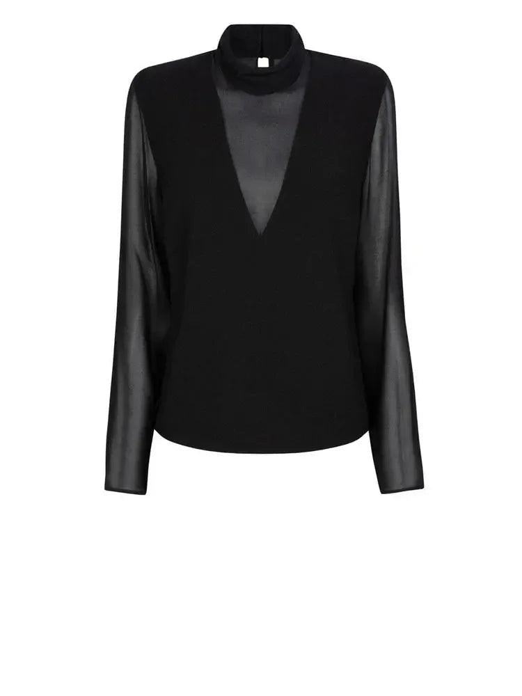 Choose this top for a seductive outfit with a transparent effect. It has a stand -up collar and long sleeves. The game with transparent and opaque fabrics ensures a sensual outfit that can be combined with both casual denims and assembled pants.