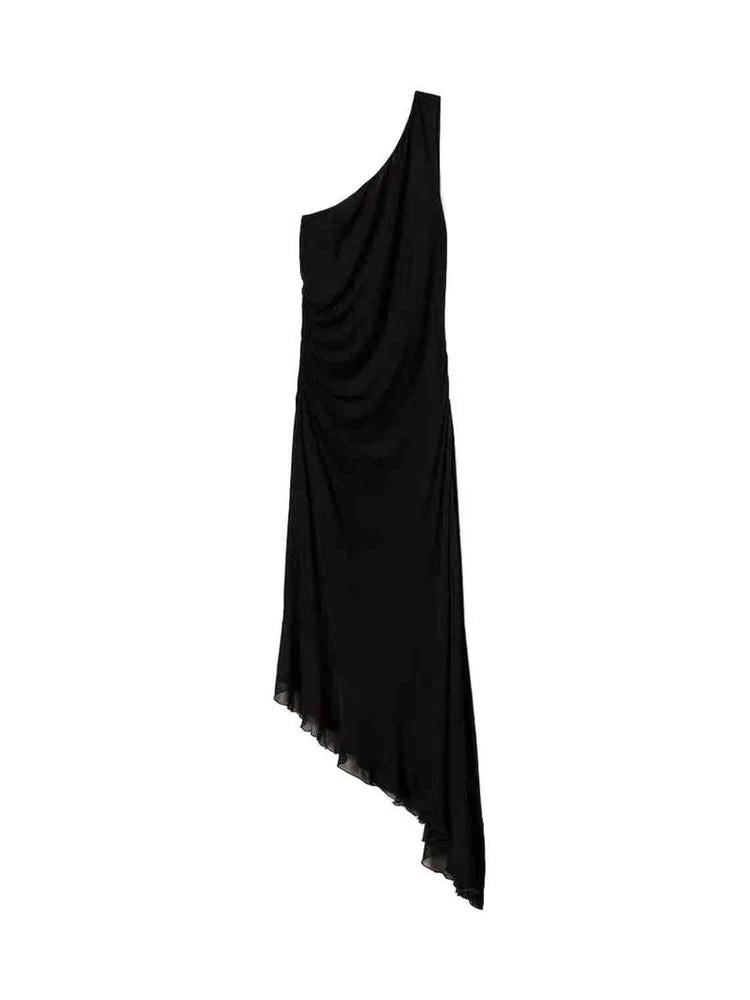 Inserted midi dress made of crepe viscosis with wrinkles on the side, asymmetrical subspecies, volant from Georgett, fed. This enforced midi dress made of crepe will be drawn to you. The lined dress is provided with a hidden side zip and a valance. The perfect choice for fine evening outfits.