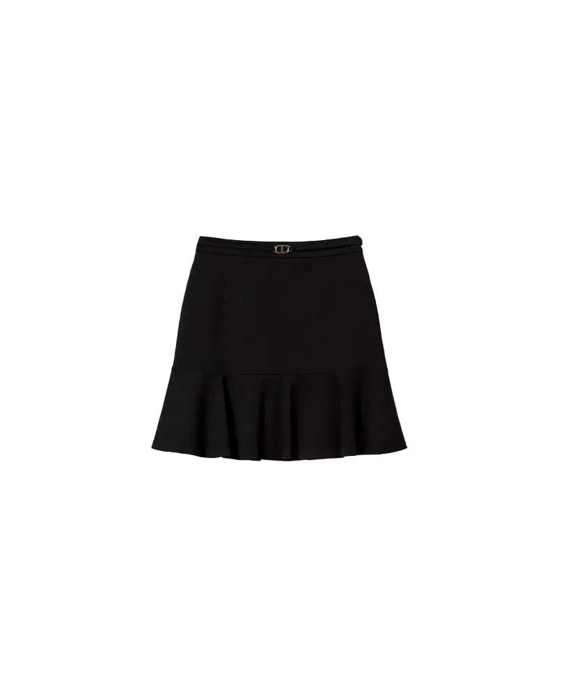 Exhibited chopped mini skirt made of Milano-knit made of viscose stretch mixture with a waist belt, side zipper and a straight pour with a volant at the lower part, which gives the overall picture movement.