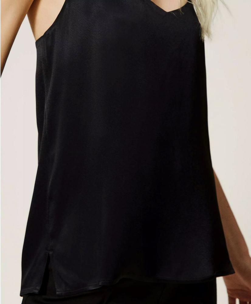 Top made of flowing viscosesatin with a deep V-neck, narrow carriers and American neckline on the back. Round your styles with this straight -line top made of flowing viscosesatin. The model is provided with narrow carriers, V-neckline at the front and American neckline. This versatile, sophisticated model from the Twinset brand is fantastic among blazers and cardigans, but also very eye-catcher top for an effective evening look.