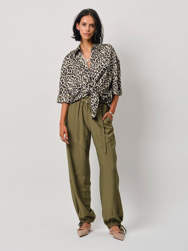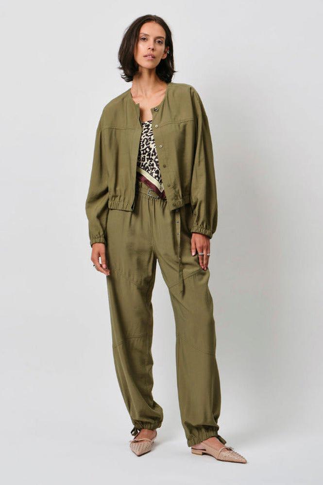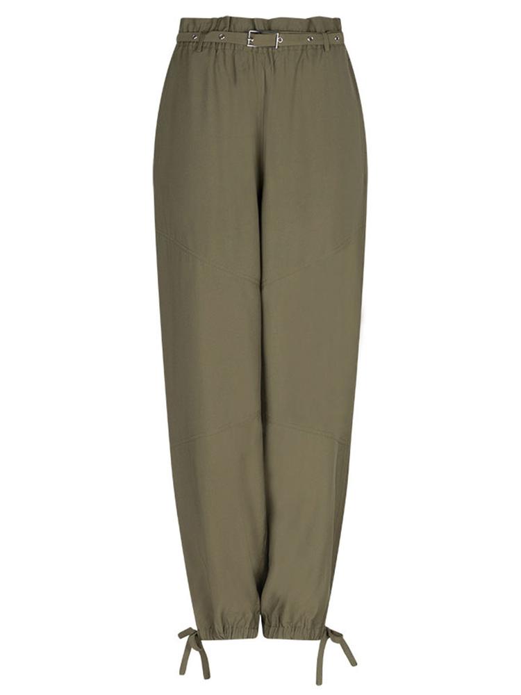 Comfortable paperbag pants for stylish looks. The Lenny pants in olive green is an absolute must-have for everyone who wants to combine comfort and style. This casual trousers in the paperbag style convinces with an elastic waistband and a suitable fabric belt that ensures a flattering fit. The elastic hems with a cord strain give it a modern touch, while stylish decorative stitching skilfully round off the design.