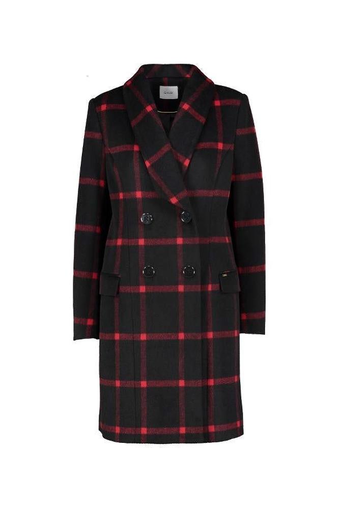 Knocking coat made of wool mixture with all-overcaroma patterns. With fashionable scarf riders. Two blind pockets at the front and with a two -row button closure. Slightly waisted design.