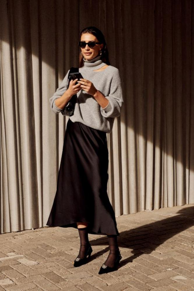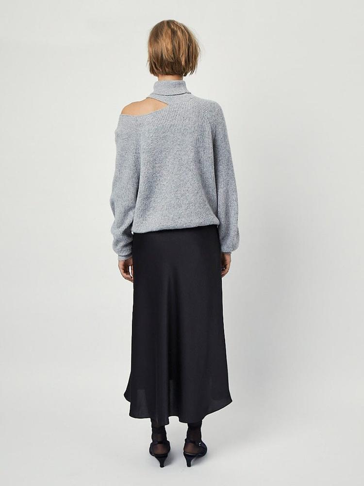 Update your wardrobe with this black midi skirt made of satin. He has a zipper and an elastic waistband. The skirt falls a little shorter at the front than in the back. Complete your look and combine it with other black satin styles, an ovSized sweater for a casual look or glittering tops for an evening outfit.