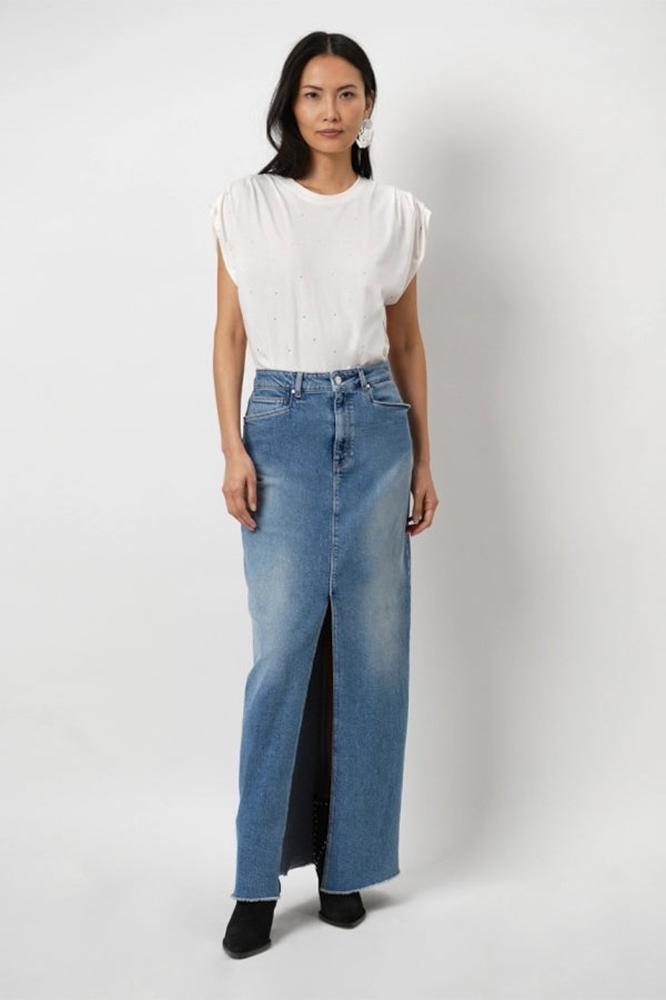 For a new T-shirt option, choose this style in butter cream. The top is made of 100% cotton and is decorated with rhinestones. The top has folds on the shoulder seam that create a beautiful silhouette. This T-shirt is perfect for everyday life and should not be missing in your wardrobe.