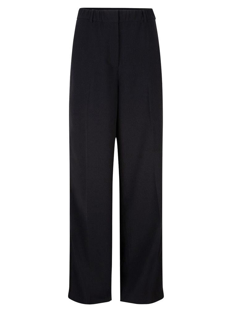 Die schwarze Anzughose ist eine klassische Hose mit Satinstreifen an der Seite. Die Taille ist hochgeschnitten, die Hosenbeine sind extra weit für ein bequemes Tragegefühl und haben eine Bügelfalte. Verollständige deinen Look mit einem passenden Blazer und einem eleganten Top für dein perfektes Outfit.