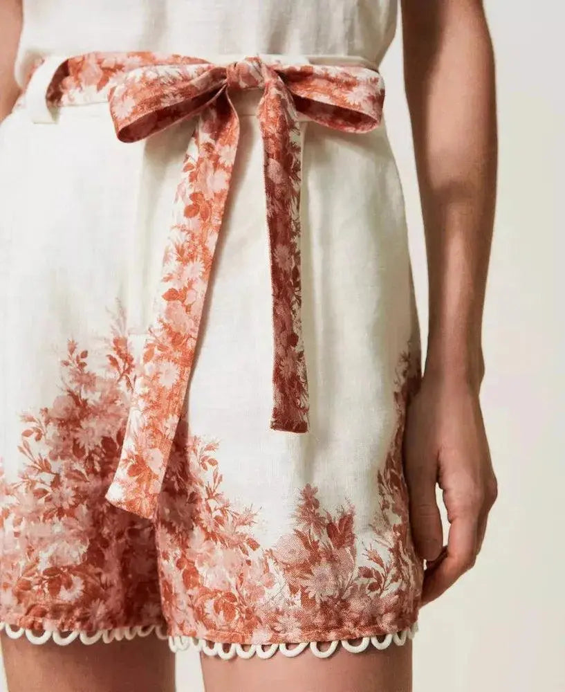 Erleben Sie den Sommer mit den TWINSET High-Waist-Shorts aus 100% Leinen, die durch ihr zartes Blumenmuster und die cremefarbene Farbgebung überzeugen. Diese Shorts verbinden Leichtigkeit und Stil und sind damit ideal für warme Tage und entspannte Anlässe. Der hohe Bund sorgt für eine schmeichelhafte Silhouette, während das atmungsaktive Leinenmaterial für optimalen Tragekomfort an heißen Tagen sorgt.